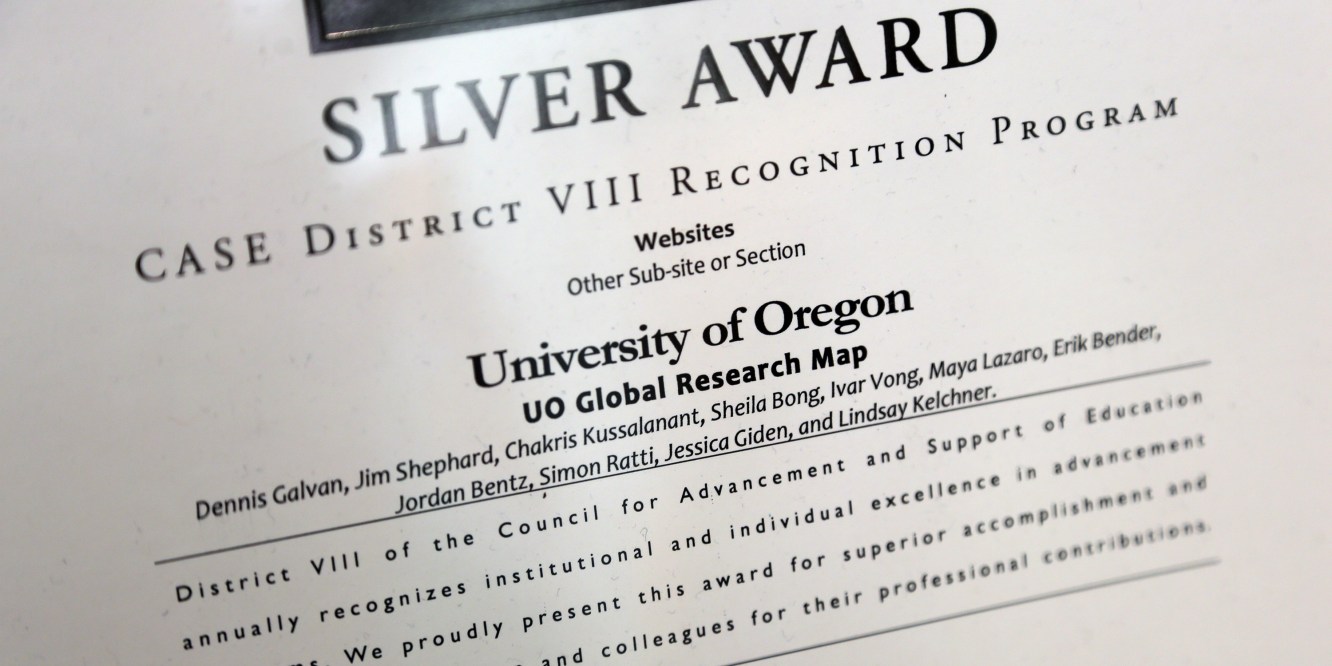 Our UO Global Research Map project was recognized at a regional and national level by the Council for the Advancement and Support of Education (CASE).