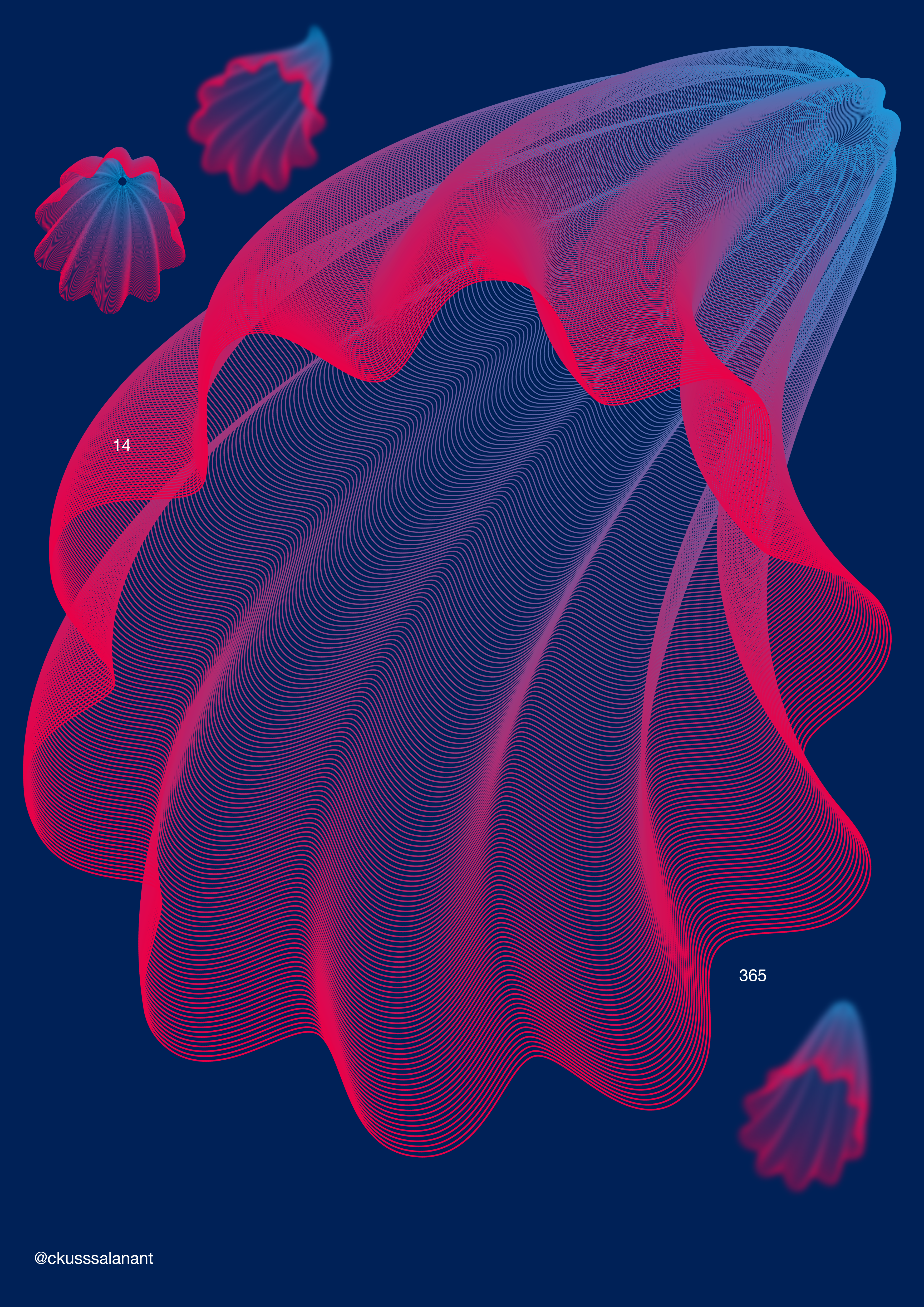 I definitely enjoyed creating a lot of the gradients that feel planetary or a view of space. I also enjoyed forms that look biological; interpretations of cells or organisms that look like macro illustrations of something that has an element of abstraction as you cannot tell the scale. I also enjoyed all of the pieces that have some degree of implied kinetic movement or displacement. I definitely avoided words or phrases, although towards the end of the project I crated a few pieces with words. The final piece is something I had somewhat envisioned halfway through the project. I designed the last poster in three different ways, but I am pretty happy with the one I published.